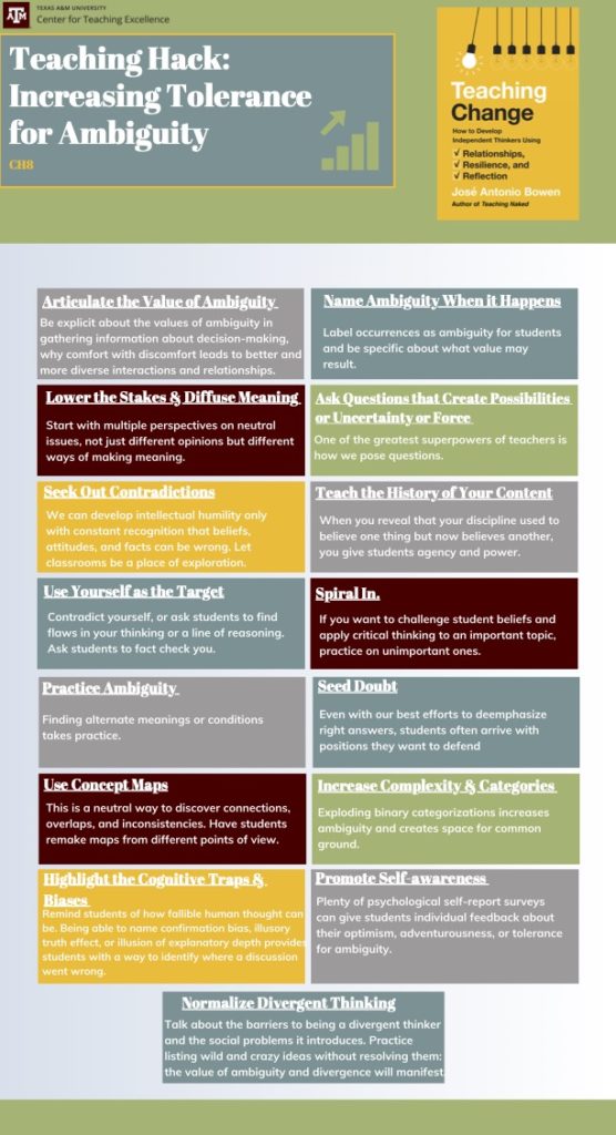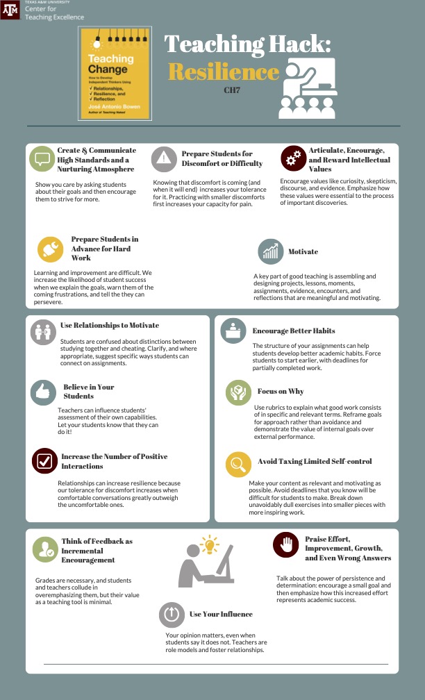 Here are some of my favorite infographics of teaching hacks from Teaching Change done for a faculty reading group at Texas A&M.